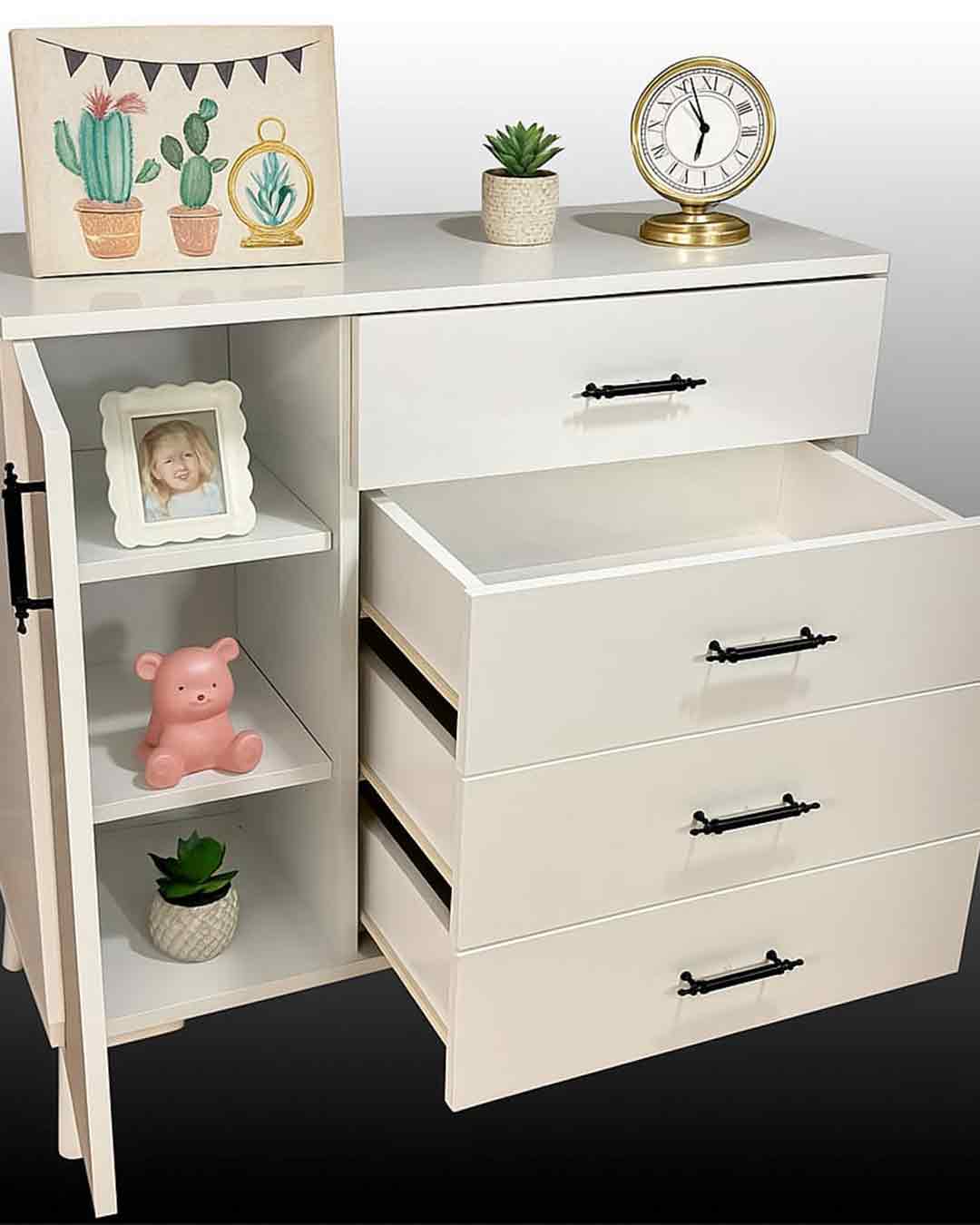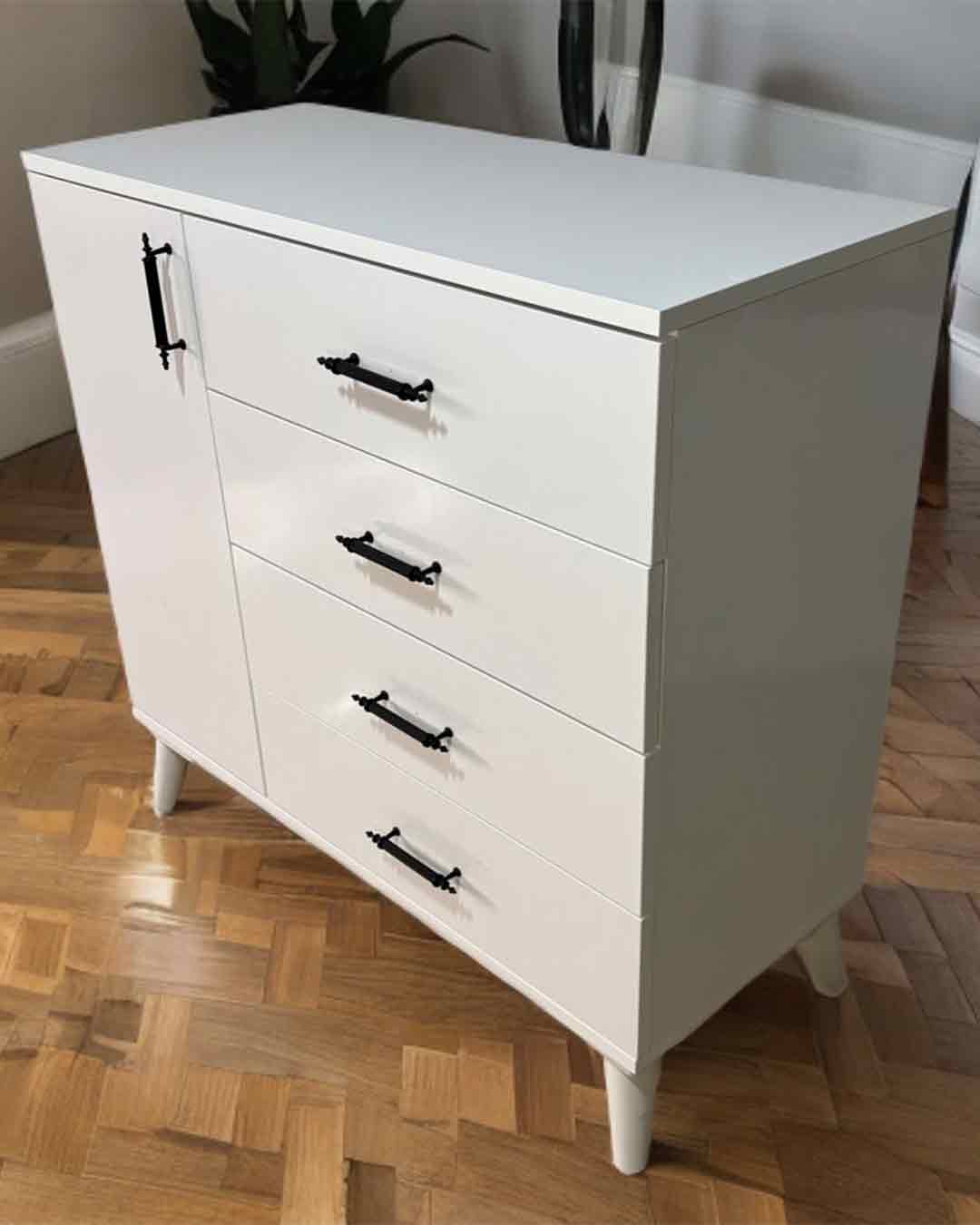 Yerden yüksek konik ayaklar, komodinin modern ve İskandinav (Nordic) duruşunu desteklerken, altının temizliğini kolaylaştırır. Bu mobilya, sadece bir şifonyer olmanın ötesinde, çok amaçlı bir depolama ünitesi olarak evinizin birçok alanında kullanılabilir.