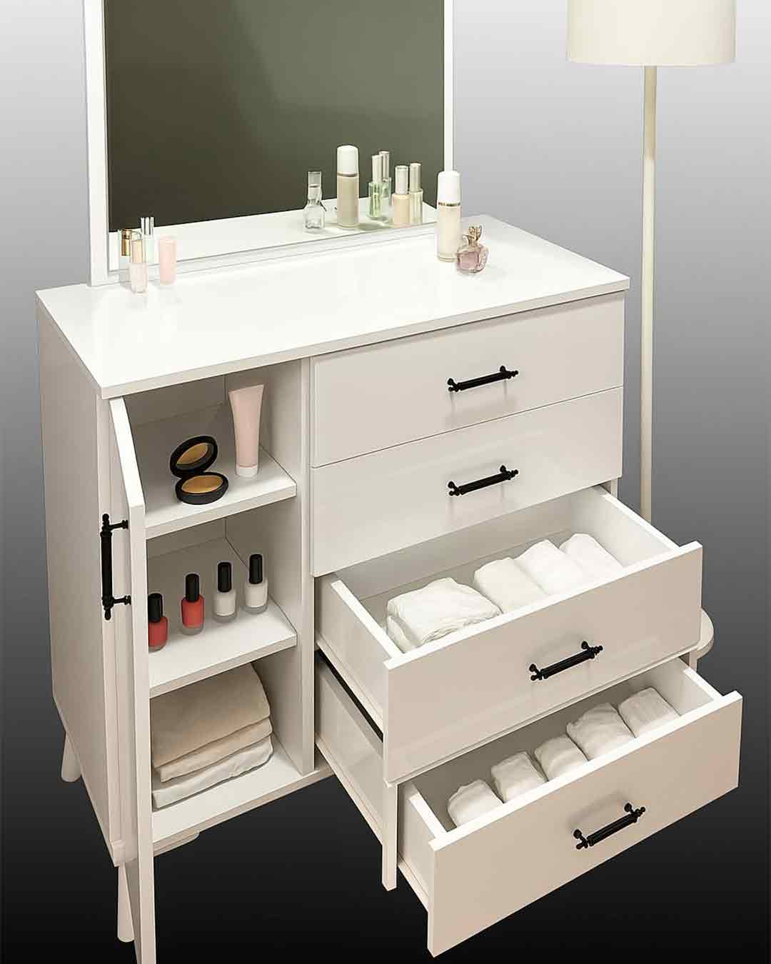 Mobilyanın tasarımı, farklı ihtiyaçlara cevap verecek şekilde dengeli depolama bölmeleri sunar. Üst yüzeyi, dekoratif objeler, lamba veya kişisel bakım ürünleri için geniş bir sergileme alanı sağlarken; yan kısımda bulunan raf üniteleri ve alt kısımdaki geniş depolama bölmeleri, eşyalarınızı kategorilere ayırarak düzenli saklamanıza olanak tanır.
