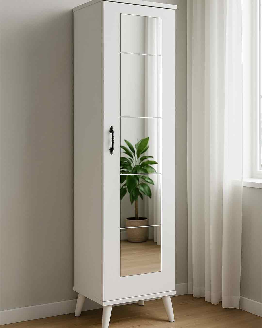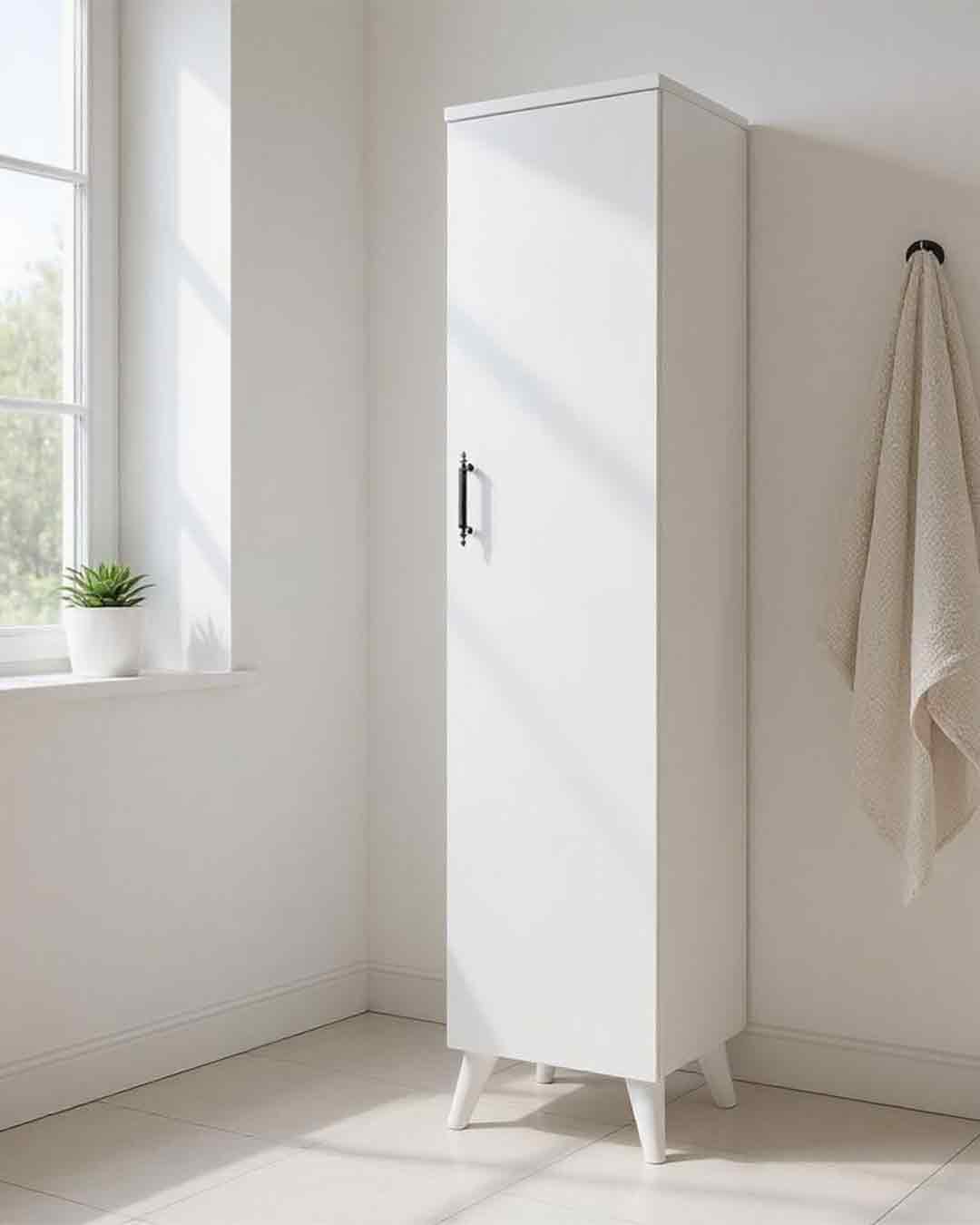 Beyazın ferahlığı ve İskandinav tarzının sade çizgilerini taşıyan bu dikey dolap, siyah dekoratif kulp detayıyla karakter kazanır. Yüksek konik ayakları ve çok katmanlı depolama hacmi ile banyo, kiler veya dar koridorlar için idealdir.